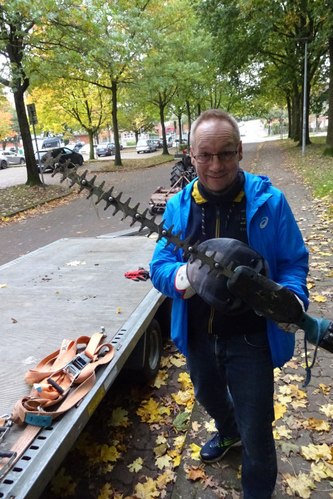 Neben dem schweren Gerät von der Fa. Maschmann Gartenbau (Danke!) hatten wir dieses mal aber auch eine eigene Kettensäge dabei, um verschiedene umgefallene Bäume zu zerteilen und vom geplanten Weg zu räumen. In diesem ansonsten weitgehend naturnah sich selbst überlassenen Areal der Wedeler Au wächst und gedeiht ja alles wirklich prächtig, so daß man da mit Geräten „unter 20cm“ nicht weit kommt. Die Säge und vor allem Benzin- und Elektro-Trimmer und -Heckenscheren erleichtern die Sache doch sehr.
