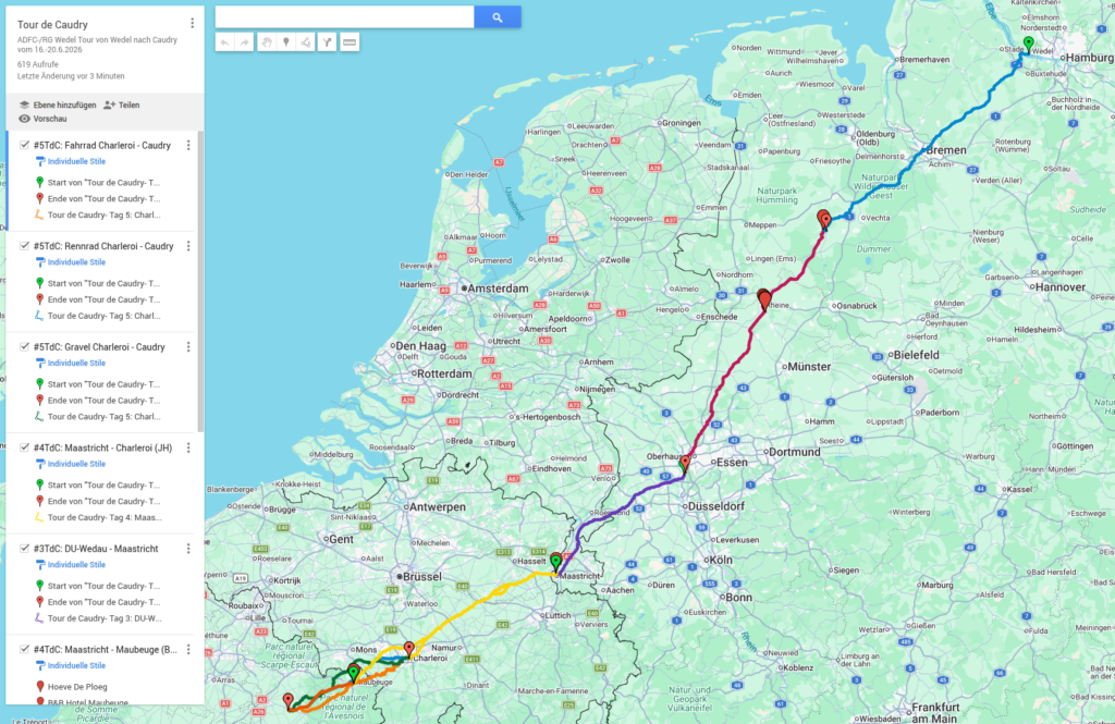 Die Tour selber ist auf 15 Teilnehmende begrenzt, 11 Anmeldungen liegen bereits vor. Wir starten am Dienstag, 16.06.2026 morgens auf Wedels Caudry-Platz am Mühlenteich und rollen dann südwest-wärts. Ankunft in Caudry wird Samstag, 20.06.2026 am frühen Nachmittag sein, zurück nach Wedel geht es am Montag, 22.06.2026. Unsere Ankunft in Wedel wird Abends sein.